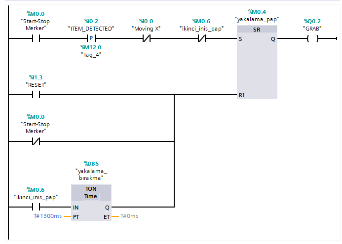 İlk inişten sonra I0.2 ile parça sensör tarafından görüldüğü anda yakalama aktif olacak. İkinci konveyörde kol aşağı indikten sonra deaktif olacak.