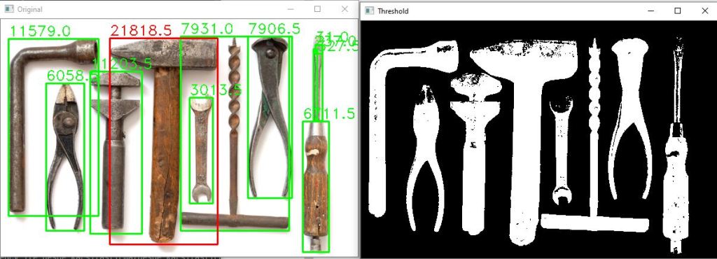 Fotoğraf diğer işlemlerin yapılması için hazır hale getirildikten sonra “contour” bulma işlemi uygulanıyor. Bu işlem ile nesneler arkaplana zıt renkte olduğu için tanınmış oluyor. Daha sonra her bulunun “contour” tek tek çizdirilip alanları hesaplanıyor ve üstlerine yazdırılıyor. Hesaplanan alanlar karşılaştırmaya tabi edilip en büyük alan ortaya çıkarılıyor. En büyük alana sahip olan nesne yeniden farklı bir renk ile belirtiliyor.