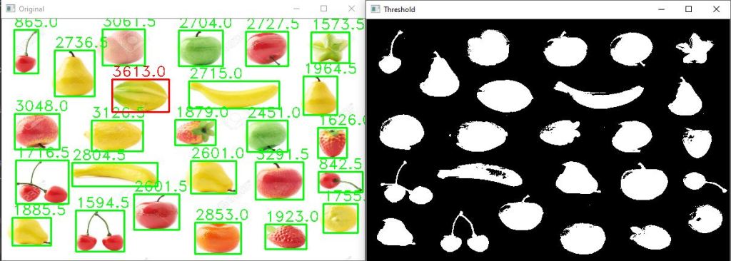 İşlemin daha verimli çalışması için fotoğraf önce terslenerek arkaplanın siyaha en yakın değere getiriyoruz. Daha sonra “grayscale” işlemi uygulayarak renklerden arındırıyoruz. Son işlem olarak da siyahların tamami ile siyah olması ve nesnelerin tamami ile beyaz gözükmesi için bir “threshold” işlemi uyguluyoruz. Fotoğrafın hesaplama yapılan hali sağ alttaki halidir.