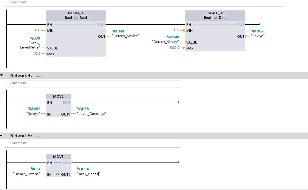 Bu uygulamada tank seviye kontrolü için TIA Portal içinde fonksiyon bloğu olarak bulunan PID_Compact fonksiyonunu kullandım. PID kontrolcü sayesinde tank setpoint değerinin ani değişimlerinde veya tankı boşaltan vananın ani değişimlerinde tank seviyesinin olabildiğince istenilen değerde kalmasını sağladım. PID sayesinde ani değişimlere çabuk ve daha yumuşak bir tepki veriliyor.