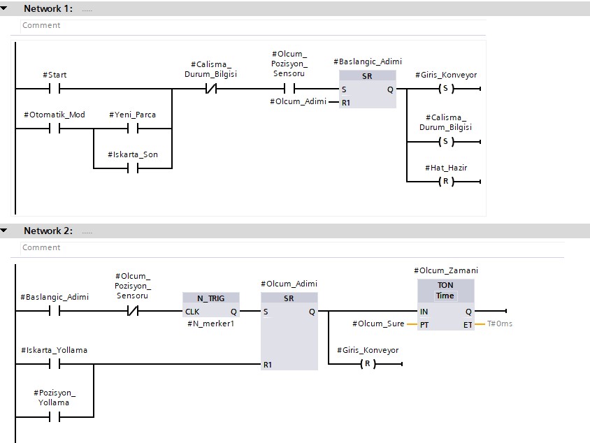 Bu uygulamada birden çok istasyonu aynı hat üzerinde tek bir PLC üzerinden kontrol ederek programı yazdım. Daha sonra bu istasyonlar için bir operatör paneli tasarladım. Sistem 3 ana bölümden oluşuyor. İlk istasyonda hatalı parçalar ayrıştırılıyor ve birleştiriliyor. İkinci istasyonda paletleniyor. Üçüncü istasyonda ise depolanıyor. Sistemin çalışma videosu aşağıdadır.